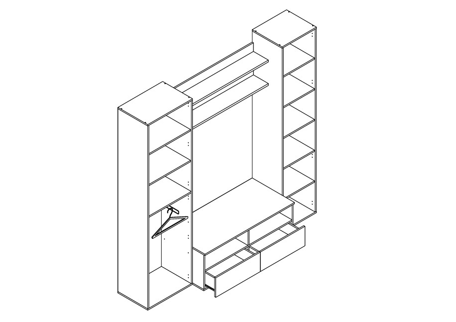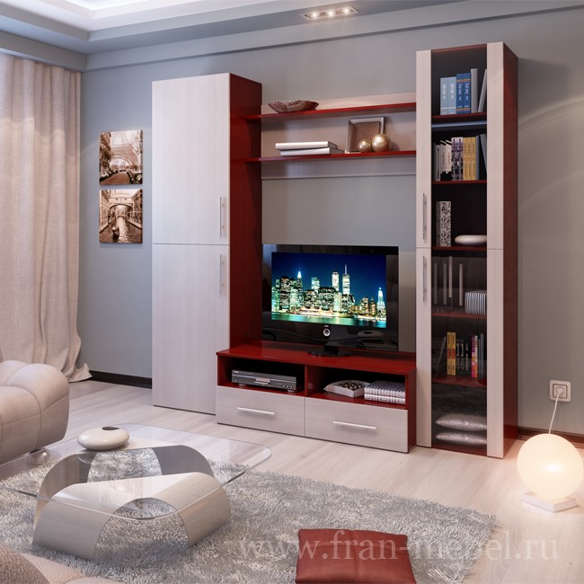 Ручки рейлинги. Каждое отделение шкафа комплектуется двумя полками, нижнее отделение — универсальное, убрав полки можно использовать выдвижную штангу для вешалок, которая уже входит в комплектацию гарнитура. Размер ТВ-тумбы позволяет вместить телевизор диагональю до 45 дюймов. Оригинальную витрину можно наполнить книгами, фоторамками и другими мелочами. Модуль с полками над ТВ-тумбой имеет заднюю стенку в цвет фасада.
